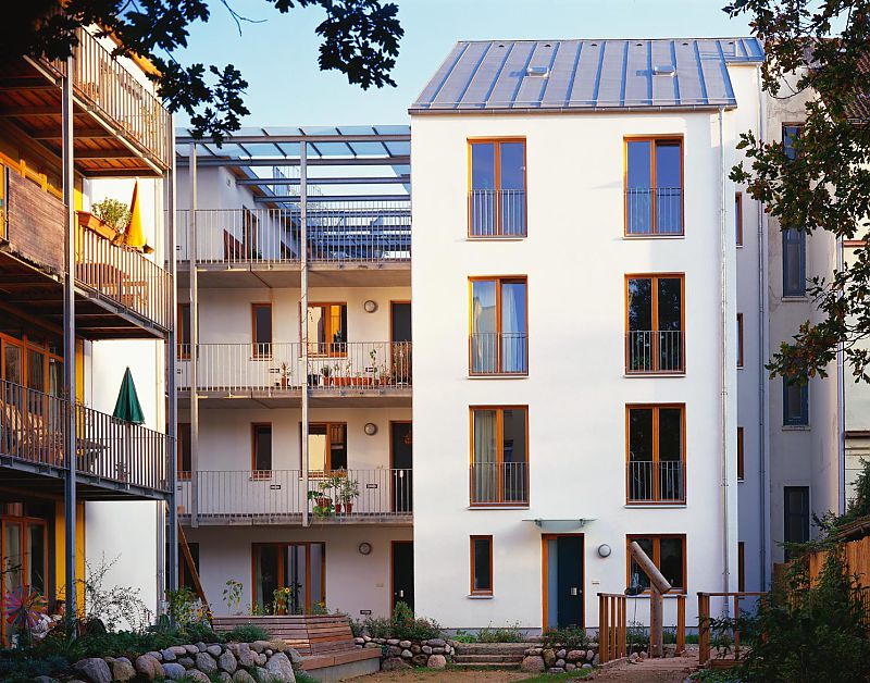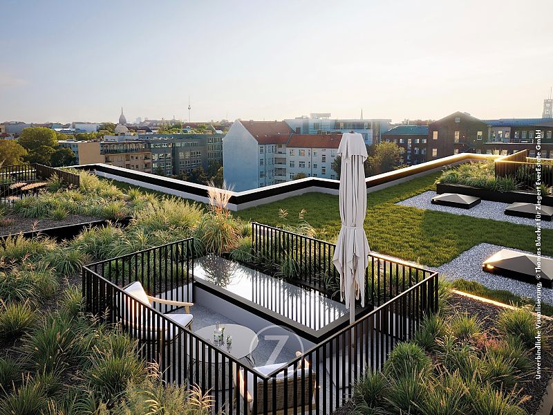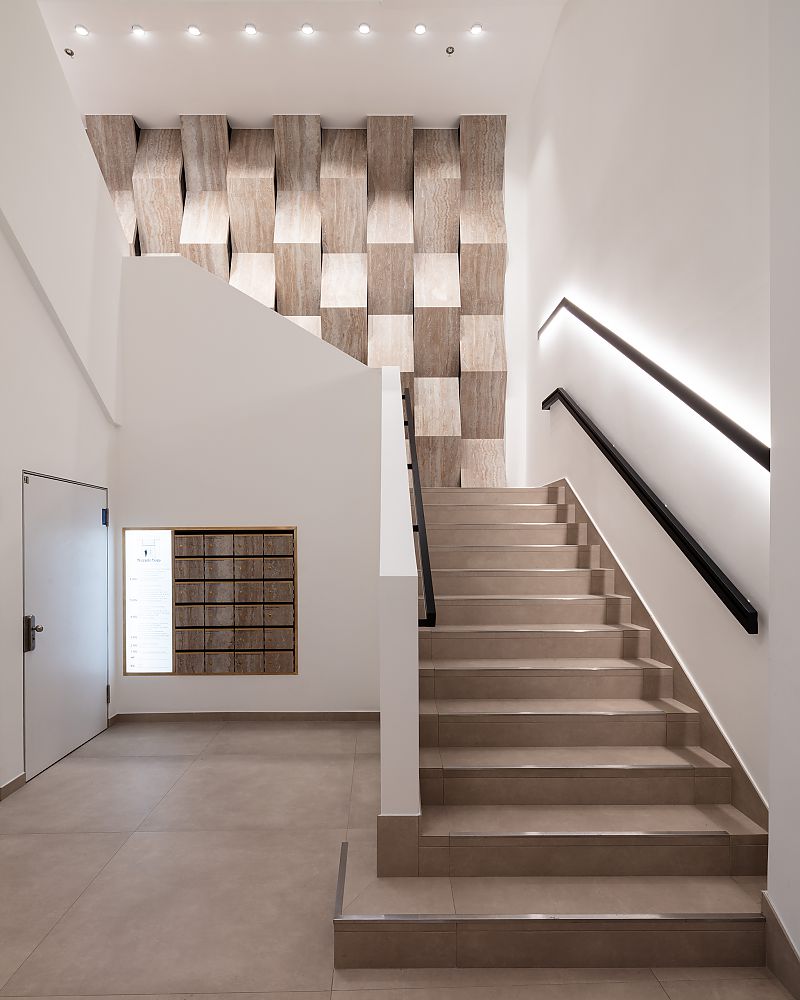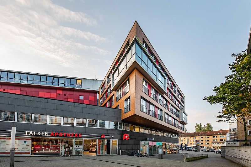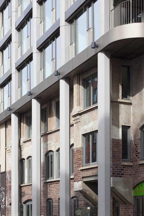 Der 6-geschossige Neubau bildet den Übergang zwischen der Bundesallee/Wilhelmsaue und versteht sich als Knotenpunkt einer modernen Hauptverkehrsader sowie der entschleunigten, von Bäumen umsäumten Nebenstraße. Urbanes Tempo trifft auf entspanntes Kiezgeschehen.