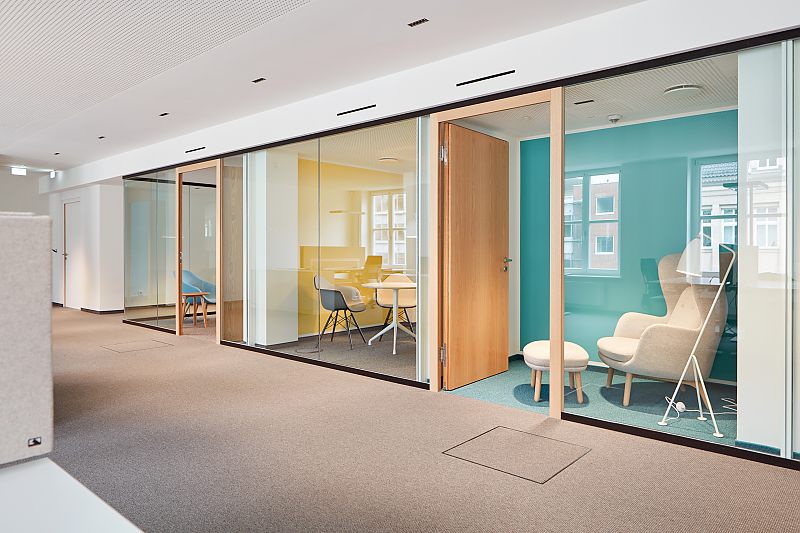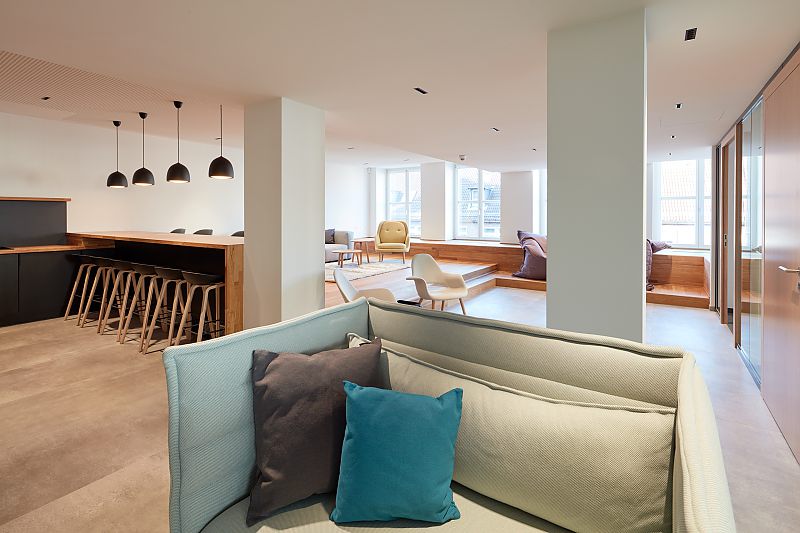 Coworking auf der Ericusspitze. Vom ersten Mietergespräch bis zur Schlüsselübergabe. Mietflächenausbau für den Eigentümer und Umsetzung des Interior Designs von JANIESCH architektur.