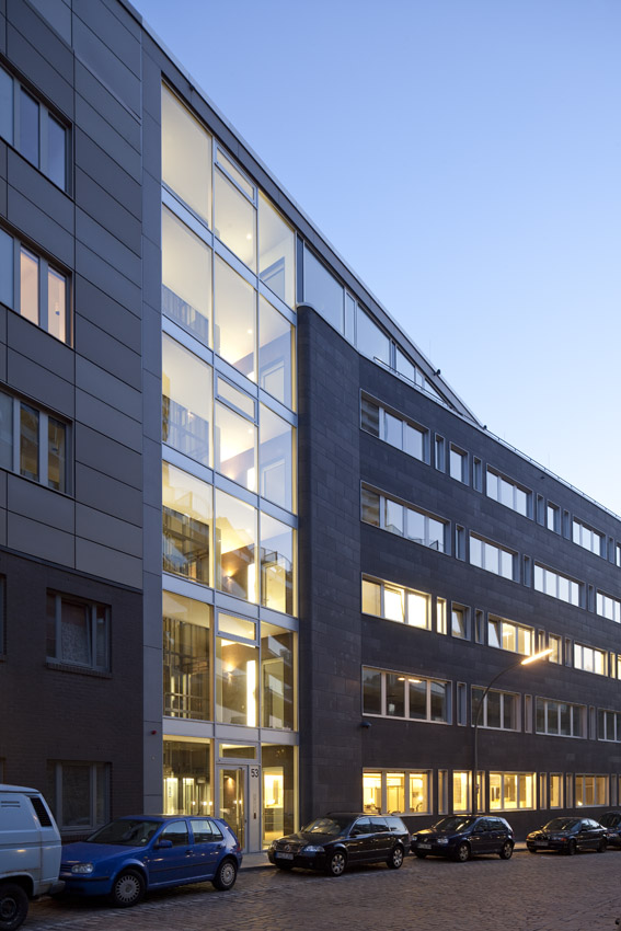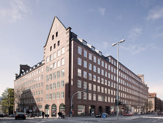 Komplett-Revitalisierung eines denkmalgeschützten Kontorhauses. Entkernung, statische Ertüchtigung und Brandschutzsanierung des Tragwerks, Wiederherstellung der historischen Fassade, Neuerstellung des südlichen Riegels und eines Parkhauses im Innenhof.